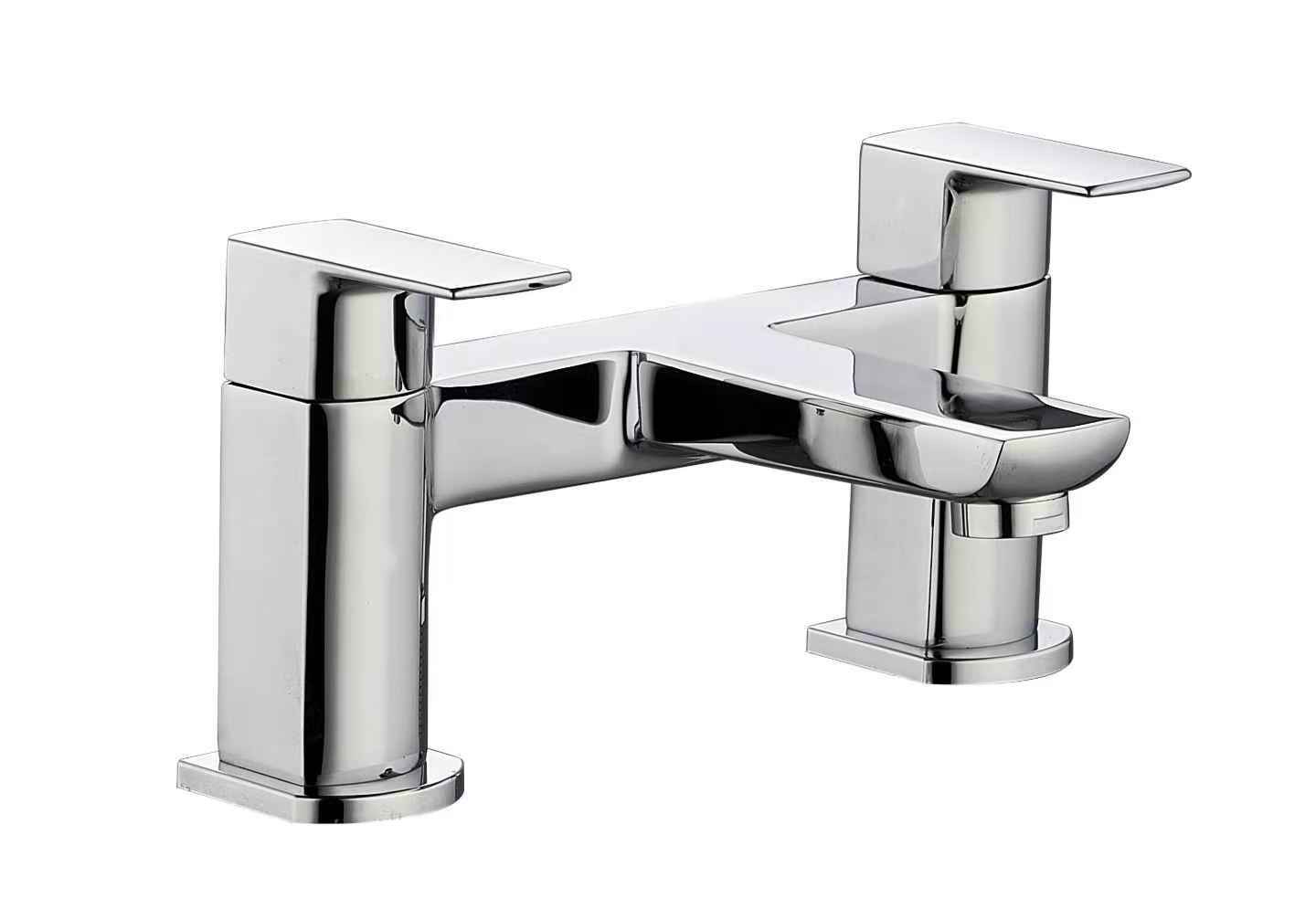 The PureForm Bath Filler, with a sleek chrome finish, is a beautifully designed deck-mounted bath mixer tap that embodies modern elegance. Its angular shape features separate handles for hot and cold water, providing precise temperature control. The wide spout and minimalist style emphasize sophistication, while the polished chrome surface adds a luxurious shimmer. This model includes two ergonomic handles and installation holes, with a robust, hard-wearing handle for durability. Engineered to mix hot and cold water seamlessly, it boasts remarkable damage resistance, making it an ideal choice for any bathroom style.