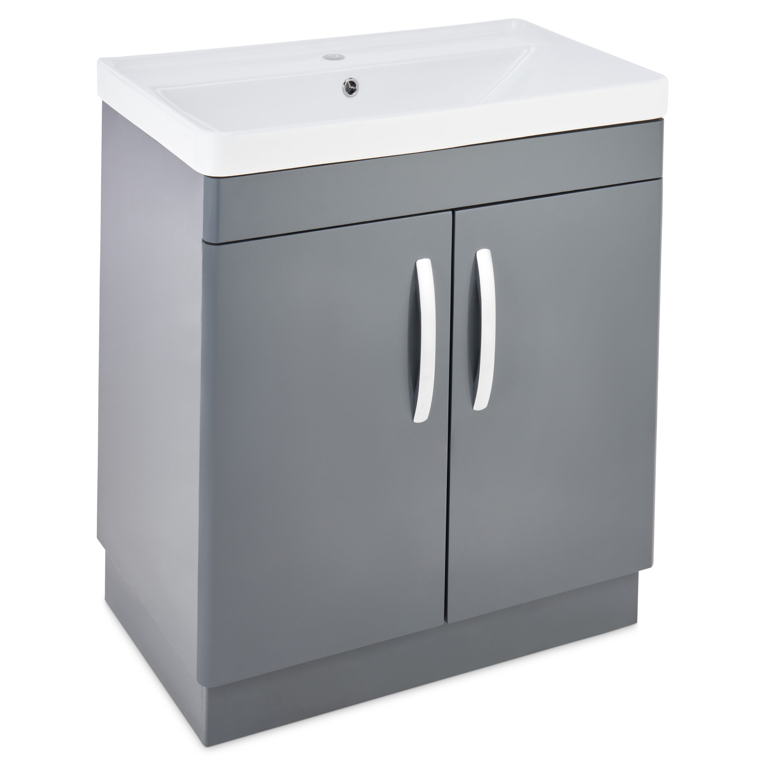 Introducing the PVC 700mm Floor Standing Dark Grey Vanity Unit, the ultimate fusion of style and functionality for your modern bathroom. Featuring a striking white ceramic basin and arriving fully assembled, this vanity unit boasts a chic dark grey finish that transforms your space into a contemporary oasis. With its generous storage capacity, this unit enables effortless organization and quick access to all your bathroom essentials, fostering a clutter-free environment that exudes tranquility. Its sleek profile is expertly designed for cloakrooms and compact areas, making it the perfect solution for maximizing space without compromising on aesthetic appeal. Experience the luxury of soft-close doors that operate gently and silently, removing the annoyance of loud slams and contributing to a serene atmosphere. Constructed from premium water-resistant PVC, this vanity unit is not only stylish but built to endure the rigors of daily use while retaining its elegant charm. Ideal for en-suites or smaller bathrooms, this compact vanity unit offers ample storage without overwhelming your space. Its timeless chrome handles provide a touch of sophistication, seamlessly merging practicality with refined elegance.