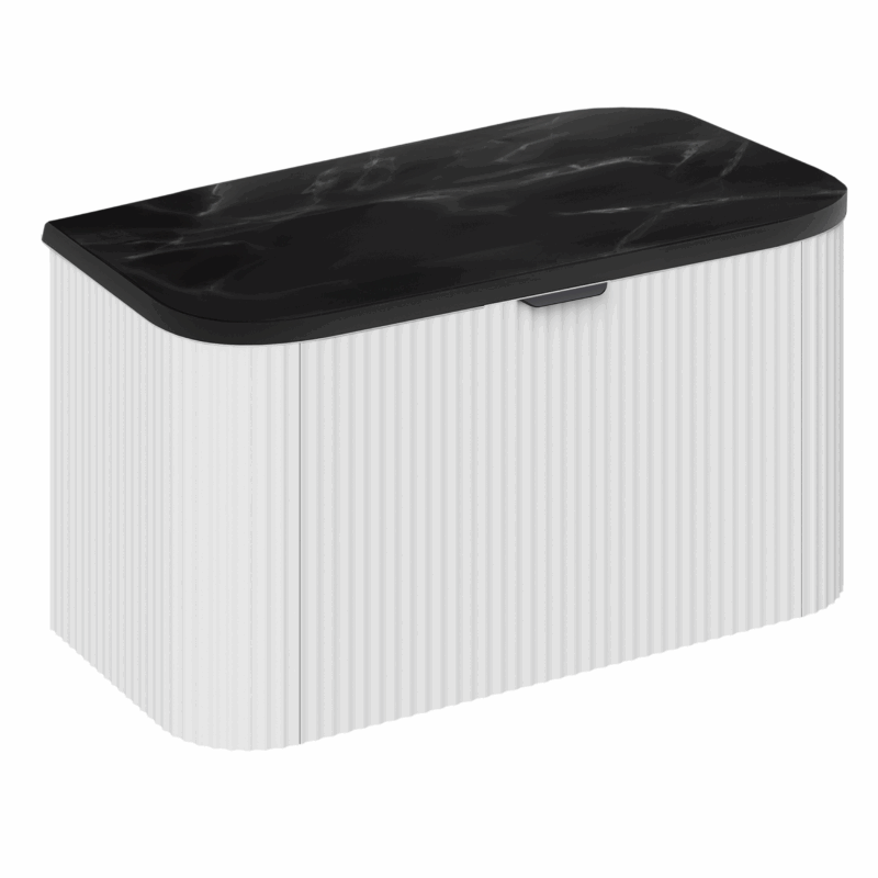 This stylish wall-hung vanity unit features an 800mm width, crafted with a glossy white PVC finish and elegant fluted detailing for a modern textured look. It is complemented by a luxurious black marble top, combining durability with sophisticated design to enhance any bathroom space. It includes high-quality, silent soft-close drawers that provide smooth and seamless operation, eliminating the inconvenience of noisy, clunky drawers.